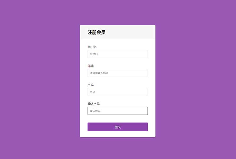 漂亮大气简约的紫色会员注册表单验证HTML页面模板源码,有简单表单验证功能,可验证用户名、邮箱、密码、确认密码是否为空。可用作各类网站的会员用户注册页面使用。源码实测后已经去除了一些暗链外链,可放心使用。